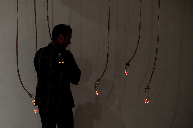 This interactive sound and light sculpture is inspired by the behavior of synchronous fireflies, which interact through a process called pulse-coupled oscillation. A network of tuned electronic chirping and blinking entities is suspended from a large sculpture. These creatures initially pulse at random rates, out of phase with each other. When a single creature "fires," its neighbors slightly adjust their cycles to try to match phase with the firing oscillator. Eventually the entire group converges, only to be disturbed by the sudden presence of an onlooker.